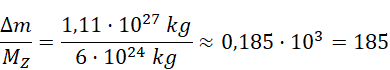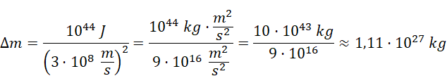 Wyznacz deficyt masy powstały w wyniku wybuchu supernowej, wiedząc, że została wówczas wypromieniowania energia 1044 J. Porównaj go z masą Ziemi oraz masą Słońca.