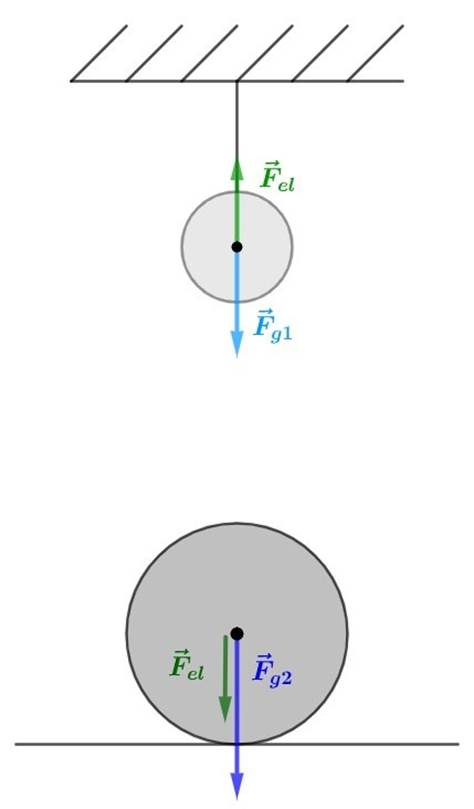 Wyznacz siłę nacisku kuli, której masa jest dwukrotnie większa od masy ujemnie naelektryzowanej kulki ładunkiem q = -6 ⋅ 10-6 C, wiedząc, że lżejsza z nich wisi na siłomierzu, a większa została umieszczona pod nią w taki sposób, że wskazanie siłomierze zmalało trzy razy. Ponadto wiadomo, że masa mniejszej z kulek wynosi 15 g, a odległość między nimi jest równa 9 cm.
