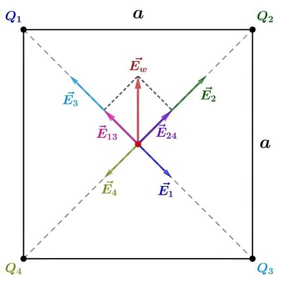 Wektor wypadkowy natężenia pola elektrycznego ma kierunek pionowy i zwrot w górę.