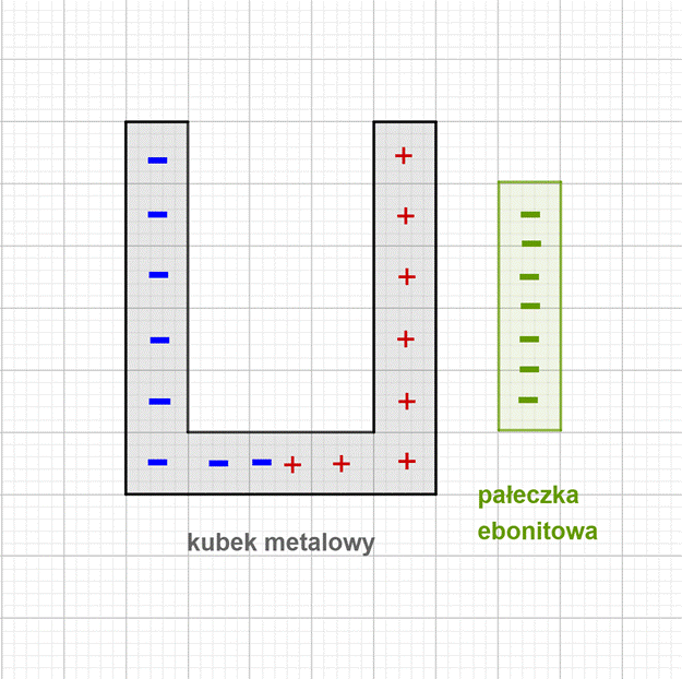 Narysuj schemat przedstawiający rozmieszczenie ładunków w kubku wykonanym z metalu oraz porcelany, podczas zbliżania do nich naelektryzowaną ujemnie pałeczkę ebonitową.