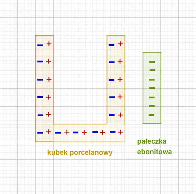 Zauważ, że metal jest przewodnikiem, wiec po zbliżeniu do kubka ujemnie naelektryzowanej pałeczki ebonitowej, pod wpływem indukcji elektrostatycznej dochodzi do przepłynięcia elektronów w budowie kubka jak najdalej pałeczki. W przypadku porcelany, będącej izolatorem, pod wpływem indukcji dochodzi do polaryzacji (rozsunięcia) cząsteczek, które układają się, tak bliżej ujemnego ładunku pałeczki znajduje ładunek dodatni.