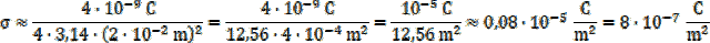 Wyznacz gęstość powierzchnią ładunku zgromadzonego na kuli wykonanej z metalu, której promień ma długość 2 cm, wiedząc, że ładunek ma wartość 4 nC.