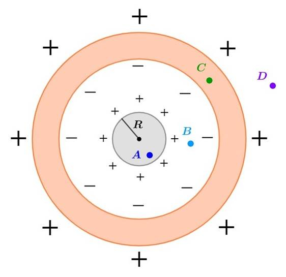 Zauważ, że punkt C znajduje się wewnątrz powłoki, która jest przewodnikiem, więc natężenie pola elektrostatycznego jest równe zeru.