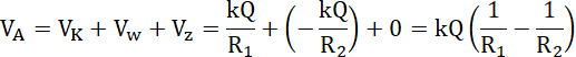 jest równy (zgodnie z zasadą superpozycji) sumie potencjałów pochodzących od trzech naładowanych powierzchni kulistych, czyli potencjału kuli