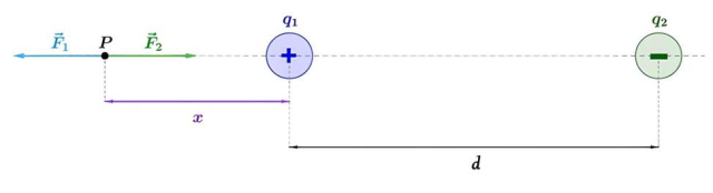 Zauważ, że skoro mamy do czynienia z dwoma ładunkami o przeciwnych znakach, to rozważamy punkt, który znajduje na zewnątrz tych ładunków. Tylko wtedy może istnieć sytuacja, w której wypadkowy wektor natężenia pola jest równy zeru. Gdyby punkt znajdował się między nimi, to wypadkowe natężenie byłoby sumą natężeń pochodzących od każdego z nich.