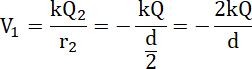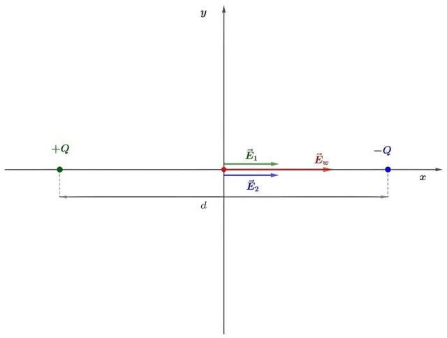 Wyznacz wzór opisujący wartość potencjału pola elektrostatycznego w środku dipola elektrycznego, który jest tworzony przez dwa różnoimienne ładunki punktowe o jednakowych wartościach bezwzględnych, które są oddalone od siebie o