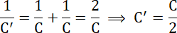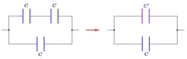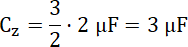 Wyznacz pojemność zastępczą układu kondensatorów połączonych następująco: dwa szeregowo z trzecim równolegle, wiedząc, że każdy z nich ma pojemność 2 μF.
