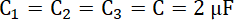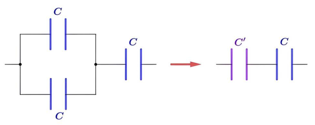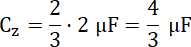 Wyznacz pojemność zastępczą układu kondensatorów połączonych następująco: dwa równolegle z trzecim szeregowo, wiedząc, że każdy z nich ma pojemność 2 μF.
