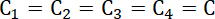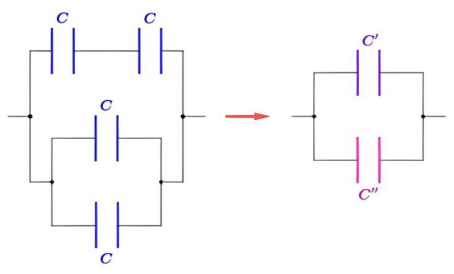 Wyznacz pojemność zastępczą układu kondensatorów ukazanych na rysunku, wiedząc, że pojemność każdego z nich wynosi