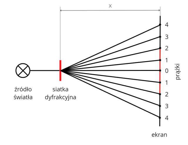 Na podstawie danych przedstawionych w treści zadania narysuj schemat opisywanego doświadczenia. Zaznacz na nim: źródło światła, siatkę dyfrakcyjną, ekran i uzyskane prążki.