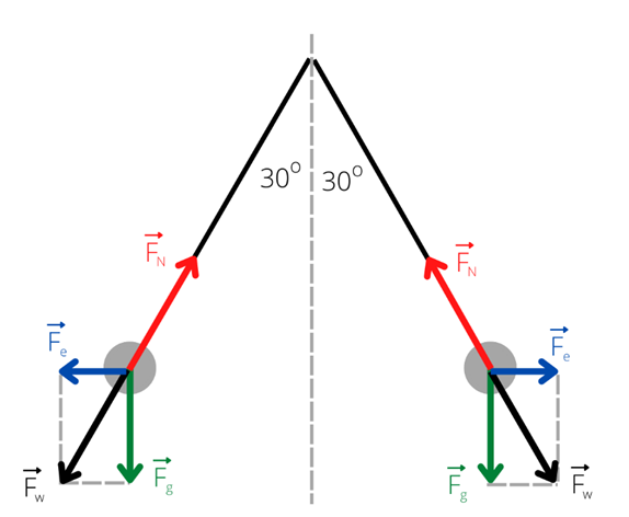 Fw – wprowadzona pomocniczo – siła wypadkowa sił grawitacji i elektrostatycznej – ma taką samą wartość i kierunek jak siła naciągu nici i przeciwny do niej zwrot – wykazuje, że kulki znajdują się w stanie równowagi