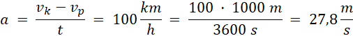 Przyspieszenie jest miarą o ile wzrosła prędkość ciała w okresie czasu. Najpierw przelicz prędkość z kilometrów na godzinę na metry na sekundę. Następnie oblicz przyspieszenie samochodu.