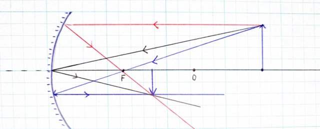 Promień pada równolegle do osi optycznej, pada na zwierciadło, a odbijając się, przechodzi przez ognisko. Inny promień pada na zwierciadło, przechodząc przez ognisko i odbity promień jest równoległy do osi optycznej. Inny promień przechodzi przez środek krzywizny zwierciadła i odbija się zgodnie z prawem odbicia – kąt odbicia równy kątowi padania.
