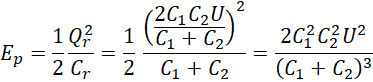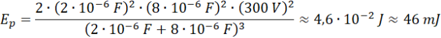 Zapisujemy wzór na energię układu kondensatorów w połączeniu równoległym. Na podstawie zależności występujących w połączeniu szeregowym obliczamy ładunek znajdujący się na kondensatorach, ponieważ w momencie odłączenia układu od baterii zgromadzony na kondensatorach ładunek się nie zmienia. Następnie obliczamy całkowity ładunek i pojemność układu w połączeniu równoległym. Wyznaczamy wzór na energię układu kondensatorów i podstawiamy odpowiednie dane liczbowe.