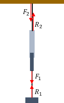 Siła F1, z jaką działa ciężarek na siłomierz, to siła ciężkości działająca na ciężarek, odpowiada jej siła R1 reakcji siłomierza. Natomiast na sufit działa siła F2, siła ciężkości ciężarka i siłomierza zamocowanych do sufitu, odpowiada jej siła reakcji R2, obie te siły są większe niż zaznaczona siła F1.