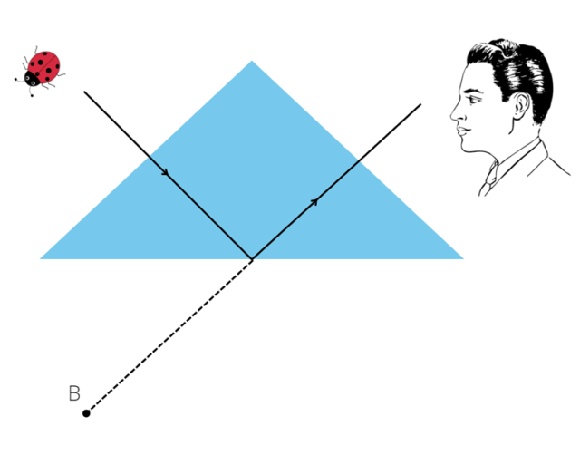 Światło padające od biedronki odbija się od ścianki pryzmatu jak od lustra. Oznacza to, że Stefan zobaczy biedronkę za powierzchnią lustra jako obraz pozorny.