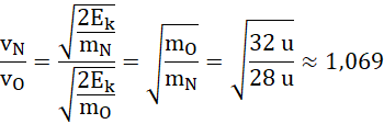 Na początku zapisujemy średnią prędkość cząsteczki za pomocą przekształconego wzoru na energię kinetyczną cząsteczki. Zestawiamy ze sobą prędkości azotu i tlenu. Energie kinetyczne obu cząsteczek są takie same, ponieważ znajdują się w tej samej temperaturze i możemy skrócić tę wielkość w otrzymanej zależności. Na koniec podstawiamy dane liczbowe i dokonujemy obliczeń.