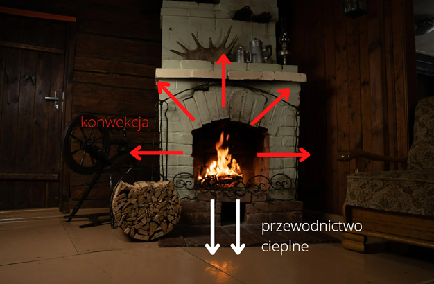 Ciepło rozchodzi się za pomocą konwekcji przez poruszające się cząsteczki powietrza oraz za pomocą przewodnictwa cieplnego przekazując energię poprzez rozgrzane drewno do cegieł.