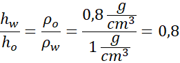Wykorzystujemy równość ciśnień w dwóch ramionach U-rurki. Przekształcamy wzór, aby otrzymać stosunek wysokości słupa wody do słupa oleju. Następnie, obliczamy jaką częścią objętości oleju jest objętość U-rurki niezajmowana przez wodę. Jeśli słup wody ma wysokość 0,8 słupa oleju, to powietrze wypełniające górną część drugiej rurki będzie miała wysokość 0,2 słupa oleju.
