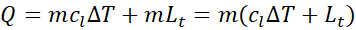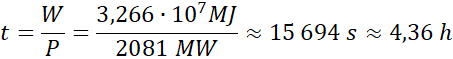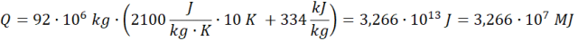 Na początku obliczamy masę bryły lodu, wykorzystując jej objętość i gęstość. Następnie zapisujemy równanie obliczające potrzebną ilość energii. Rozpisujemy je, wykorzystując wzór na ciepło. Aby obliczyć czas potrzebny elektrowni, korzystamy ze wzoru na moc.