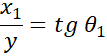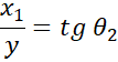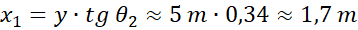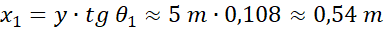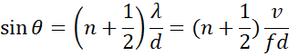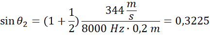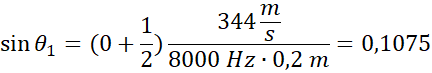 Stosujemy wzór na wygaszenie fali przy zgodności fazy źródeł, obliczając sinusy kątów. Obliczamy odległość fali od punktu 0 na ścianie, korzystając z funkcji tangens.