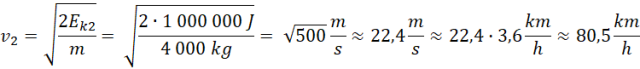 Na początku zamieniamy jednostki w danych z treści zadania na jednostki występujące w układzie SI. Następnie obliczamy początkową energię kinetyczną i zauważamy, że po pewnym czasie zamieniła się ona w pracę sił oporu oraz pozostałą energię kinetyczną. Obliczamy energię kinetyczną po odjęciu pracy sił oporu. Na koniec przekształcamy wzór na pozostałą energię kinetyczną w taki sposób, aby otrzymać wzór na prędkość końcową pojazdu.