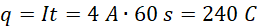 Oblicz wartość ładunku przepływającego przez obwód lodówki, jeśli w czasie 1 minuty przez jej obwód przepływa prąd o natężeniu 4 A.