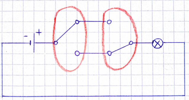 W tym zadaniu narysuj schemat, który posiada tylko jedną żarówkę, baterie, dwa przełączniki, a spełnia warunki przedstawione w opisie.