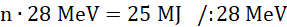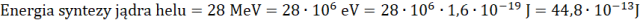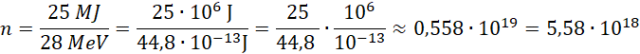 Liczba jąder helu (n) potrzebna uzyskania energii 25 MJ to iloczyn liczby jąder i energii powstałej w wyniku syntezy jednego jądra.