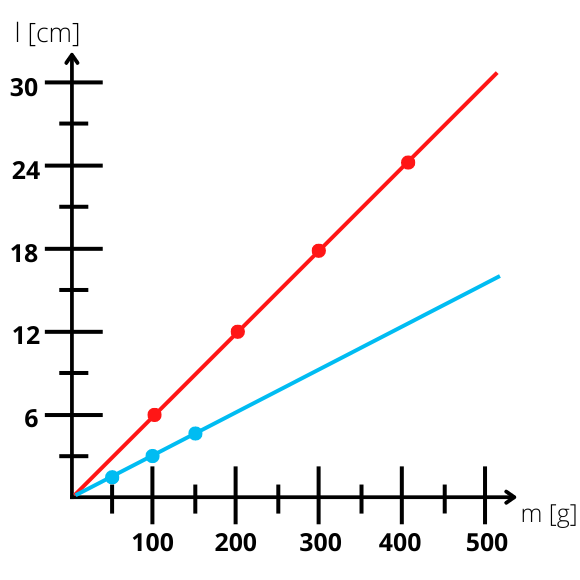 Aby narysować wykresy rozciągnięcia sprężyn od obciążenia w jednym układzie osi, możesz skorzystać z wykresu z zadania 4 i nanieść na niego punkty pomiarowe dla sprężyny z doświadczenia (są to punkty (50; 1,5), (100; 3), (150; 4,5)) oraz połączyć je linią prostą.