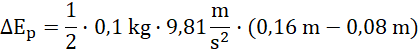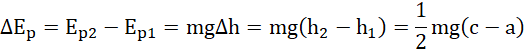 Zauważ, środek ciężkości klocka znajduje się dokładnie w jego środku, więc jego wysokość od podłoża to polowa aktualnej wysokości klocka (zależnej od jego położenia). Przyrost energii potencjalnej obliczysz, odejmując od końcowej energii potencjalnej, energię potencjalną z początku badania. Przyrost wysokości to różnica między wysokościami punktu ciężkości względem podłoża.