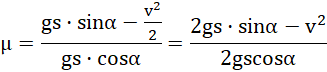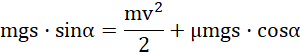 Zauważ, część energii mechanicznej ciała zostaje przekształcone w pracę wykonaną przez siłę tarcia. Suma tej pracy i pozostałej energii to nadal wartość całkowitej energii mechanicznej na początku ruchu. Na szczycie równi, pudełko ma tylko energię potencjalną (wysokość równi otrzymasz, mnożąc jej długość i sinus kąta nachylenia), zaś u podnóża – energię kinetyczną, pomniejszoną o wartość pracy siły tarcia. Siła tarcia to iloczyn masy, przyspieszenia ziemskiego i współczynnika tarcia, a praca to iloczyn siły, przemieszczenia i cosinusa kąta pomiędzy tymi wektorami – u podnóża pudełko stoi poziomo, więc kąt ma wartość α.