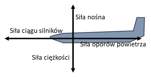 Samolot porusza się, ponieważ silniku działają z siłą ciągu, ruch samolotu powoduje powstanie sił oporów powietrza. Aby samolot mógł się wznieść, korzysta z siły nośnej, która powstaje na skutek różnicy ciśnień po obu stronach skrzydła w czasie ruchu samolotu i jest w stanie przeciwstawić się sile ciężkości samolotu.