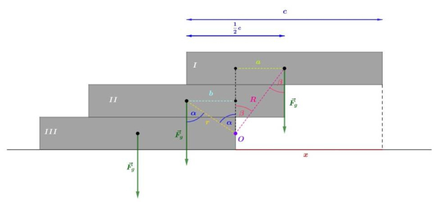 jest równy zeru. Obierz oś obrotu wzdłuż prawej krawędzi dolnego kamienia, a następnie wyznacz moment każdej z sił, używając wzoru na moment siły