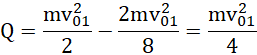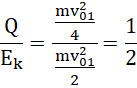 Pamiętaj, podczas zderzenia niesprężystego ciała zlepią się ze sobą i będą poruszać się ze wspólną prędkością. Skorzystaj z zasady zachowania pędu – pęd początkowy to pęd jadącego wózka (drugi wózek nie porusza się), a pęd końcowy to pęd połączonych wózków (iloczyn prędkości wspólnej i sumy mas wózków). Po zderzeniu wózków część energii kinetycznej układu zostaje zamieniona w energię wewnętrzną ciał (która jest równa wytworzonemu ciepłu). Oznacza to, że ciepło to różnica energii kinetycznej jadącego wózka sprzed zderzenia i energii kinetycznej połączonych wózków po zderzeniu (energia nieruchomego wózka przed zderzeniem wynosi zero). Wstaw do równości wcześniej wyznaczoną prędkość wspólną. Na koniec podziel otrzymane ciepło przez całkowitą energię kinetyczną.