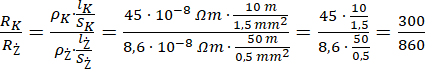 – opór właściwy substancji, który odczytujemy z tablic fizycznych. Aby wiedzieć, który z nich ma większy opór, obliczamy ich stosunki, z którego odczytujemy, że opór żelaza jest większy.