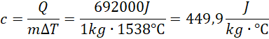 . Przekształcamy ten wzór tak, aby uzyskać wartość ciepła właściwego. Z wykresu widzimy, że dla temperatury 1538°C, gdy substancja jest ciałem stałym, ilość ciepła właściwego wynosi 692 kJ, czyli 692 000 J.