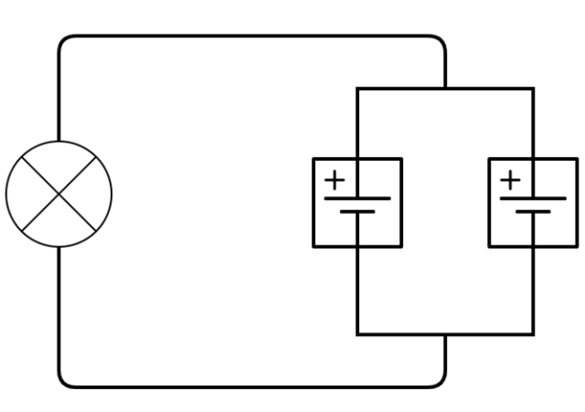 Narysuj w zeszycie schemat elektryczny. Określ związek pomiędzy natężeniami prądów płynących przez baterie a natężeniem prądu płynącego przez żarówkę.