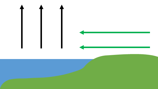 Tak samo jak pierwotnej ilustracji do zadania zielone linie oznaczają powietrze zimne, a czarne – ciepłe. Zimne powietrze znad lądu napływa nad cieplejszą wodę, gdzie się ogrzewa, a następnie na skutek konwekcji unosi do góry.