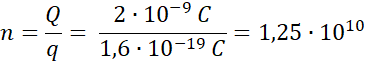 Pomiędzy kulkami przepłynie poła ładunku pierwszej kulki, ponieważ ładunek dąży do równomiernego rozłożenia elektronów. Ilość elektronów obliczamy dzieląc ładunek, który przepłynął przez ładunek pojedynczego elektronu.