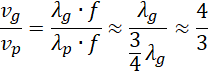 Z rysunku można odczytać, że 4 długości fali na wodzie płytszej odpowiadają trzem długościom fali na wodzie głębszej. Zapisz stosunek prędkości fal, korzystając z odpowiedniego wzoru. Na koniec podstaw przybliżone wartości i skróć wielkości powtarzające się w liczniku i mianowniku.
