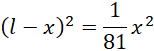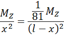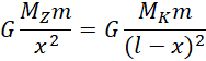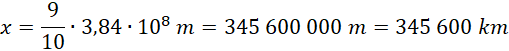 Przyrównujemy do siebie siły grawitacji pochodzące od Ziemi i od Księżyca. Stosujemy wzór na siłę grawitacji, zadając odpowiednio odległości od ciała. Korzystamy z zależności między masami i skracamy wielkości występujące po obu stronach równania. Na koniec używamy pierwiastkowania i podstawiamy dane liczbowe.