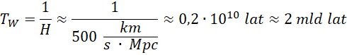Wykorzystujemy wzór na wiek Wszechświata i podstawiamy dane liczbowe.