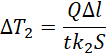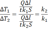 Wykorzystujemy wzór na szybkość przekazania ciepła. Przekształcamy go do postaci zależności na przyrost temperatury dla obu warstw i zestawiamy zależności ze sobą. Skracamy odpowiednie wielkości i otrzymujemy wynik końcowy.