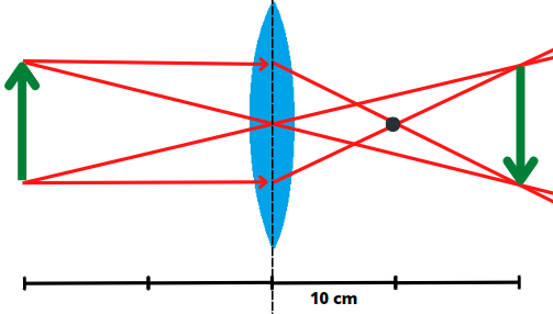 Obraz znajduje się w takiej samej odległości od soczewki jak obiekt. Jest on tej samej wielkości, lecz odwrócony.