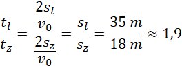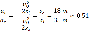 Wiedząc, że samochód jedzie z prędkością o wartości 45 km/h wyraź ilorazy wartości przyspieszeń i czasów hamowania samochodu na oponach letnich i zimowych za pomocą ilorazu dróg, jeśli droga hamowania na ośnieżonej jezdni na letnich oponach