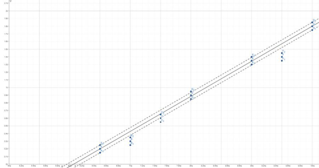 W tym zadaniu wykres musisz sporządzić z zależności napięcia hamowania od częstotliwości promieniowania padającego na katodę fotokomórki za pomocą podanych w tabeli wartości. Najpierw wyznacz punkty pomiarowe z tabeli (A-G) oraz niepewności pomiarowe równe ±0,05V dla każdego z punktów pomiarowych (A1-G1) i (A2-G2). Następnie poprowadź linię trendu przez punkty pomiarowe oraz przez punkty niepewności pomiarowych.