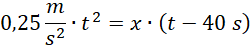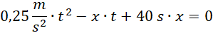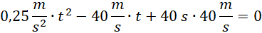 Zapisujemy wzory na drogę samochodu i motocyklisty. Przyrównujemy je do siebie i obliczamy deltę powstałego równania kwadratowego. Aby równanie miało przynajmniej jedno rozwiązanie, delta powinna być równa 0. Zapisujemy ten warunek i rozwiązujemy równanie.