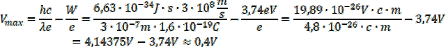 W podpunkcie b) korzystając ze wzoru na bilans energetyczny zjawiska fotoelektrycznego i wzoru na energię fotonów wyprowadziliśmy wzór na maksymalny potencjał płytki.