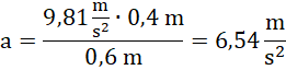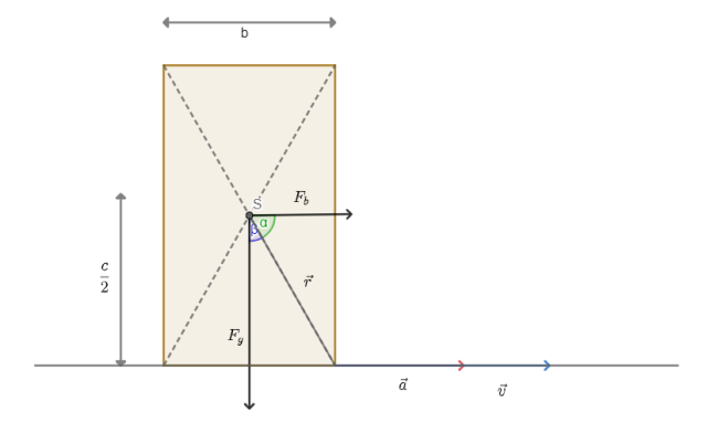Pamiętaj, nieinercjalny układ odniesienia, to taki układ, który porusza się z pewnym przyspieszeniem względem pewnego innego układu odniesienia – w naszym przypadku wnętrze pociągu jest właśnie nieinercjalnym układem odniesienia. Zastanów się, jakie siły działają na walizkę – jest to siła ciężkości oraz siła bezwładności (nie uwzględniamy tarcia), aby walizka przewróciła się, siła bezwładności musi być większa od siły ciężkości. Wypiszmy momenty podanych sił w prawym dolnym rogu walizki – są to iloczyny danej siły, odległości od jej punktu przyłożenia i sinusa pomiędzy tymi wektorami. Zbadajmy przypadek graniczny, czyli przyrównajmy do siebie wartości obu momentów sił, zastąp sinusy stosunkami odpowiednich wartości wektorów (posiłkuj się własnym, bądź przygotowanym w rozwiązaniu rysunkiem) oraz w miejsce siły grawitacji wpisz iloczyn masy i przyspieszenia ziemskiego, a siły bezwładności – iloczyn masy i przyspieszenia pociągu (nasza szukana). Wyznacz szukaną wartość przyspieszenia, walizka przewróci się, gdy przyspieszenie pociągu będzie większe od otrzymanego wyniku, czyli gdy przekroczy wartość graniczną.